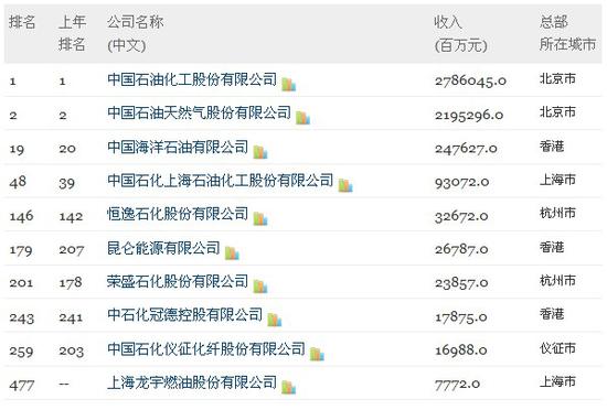 石油天然氣方面,上海龍宇燃油股份有限公司也首次加入500強陣營,位居第477位。
